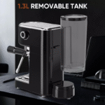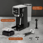 The espresso machine’s design fits any kitchen and features a detachable water tank and drip tray for hassle-free cleaning. Included are the machine, portafilter, funnel, coffee scoop, and a user manual.