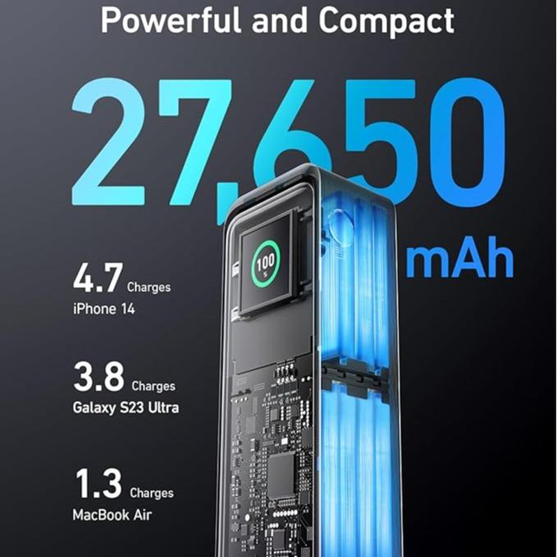 Portable for Long-Haul Power: Despite its compact, soda can-sized dimensions, this power bank boasts a 27,650mAh capacity. It can charge a 13-inch MacBook Air (M2) 1.28 times or an iPhone 14 approximately 4.67 times. Compliant with TSA regulations (