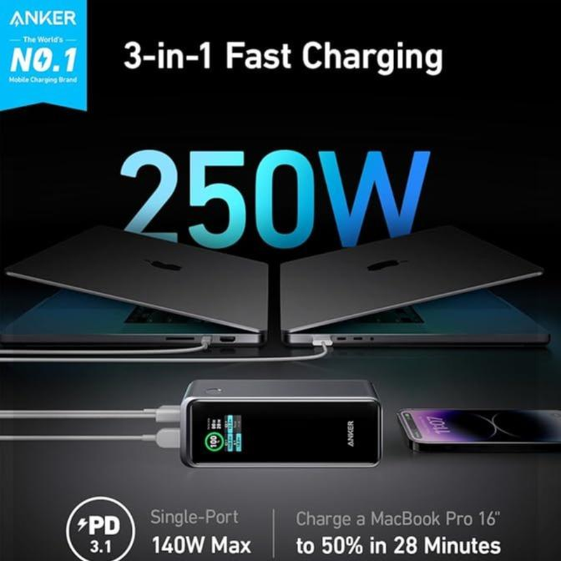 250W Multi-Device Fast Charging: With 2 USB-C ports and 1 USB-A port, this power bank delivers up to 250W, boosting a MacBook Air (M2) to 30% in just 13 minutes. Ideal for time-sensitive charging needs.