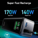170W Fast USB-C Recharge: Recharge your power bank at lightning speed with the convenience of dual USB-C ports, allowing you to fully replenish it in just 37 minutes. Note: When the power bank is fully depleted (screen inactive), the base charging will automatically shut off. Please recharge via the USB-C port first to restore base charging functionality.
