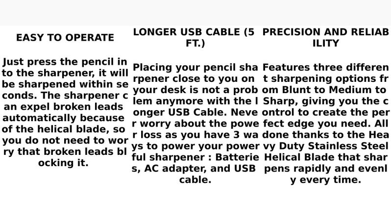 Its razor-sharp helical blade and powerful motor are designed to provide you with a smooth and uniform cut. Great for graphite and colored pencils. It’s really easy to use; just choose one of the 3 settings – blunt, middle, and sharp. Compact size and multiple power source choices make it the perfect portable pencil-sharpening solution – one that you can take along anywhere you go!