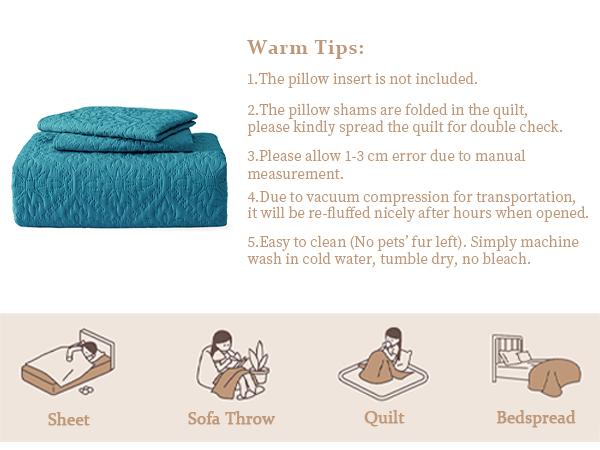 • All Season Use: The lightweight quilt set is suitable for all seasons especially during summer or warm days when you just need a sheet or blanket underneath. Also, it can be used as bedspreads or coverlets to keep you cozy and warm over or under the duvet or comforter in cold weather