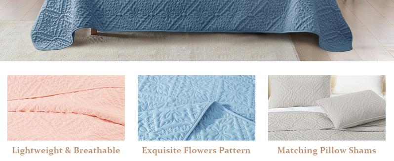 • Exquisite Home Decor: The bedspread features exquisite flowers pattern quilted with ultrasonic embossing technology which makes the bedding set more lightweight, sturdy and artistic. Combined with attractive colors, the coverlet set is easy to match your bedroom decor, offering you an elegant and classic feeling