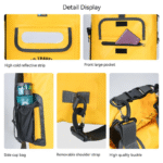 - Front Pocket: Allows for easy access to small necessities without digging into the main compartment. Note: This pocket is not completely waterproof but splash-proof, so do not put valuables like your phone. The pocket is designed to hold small items securely.