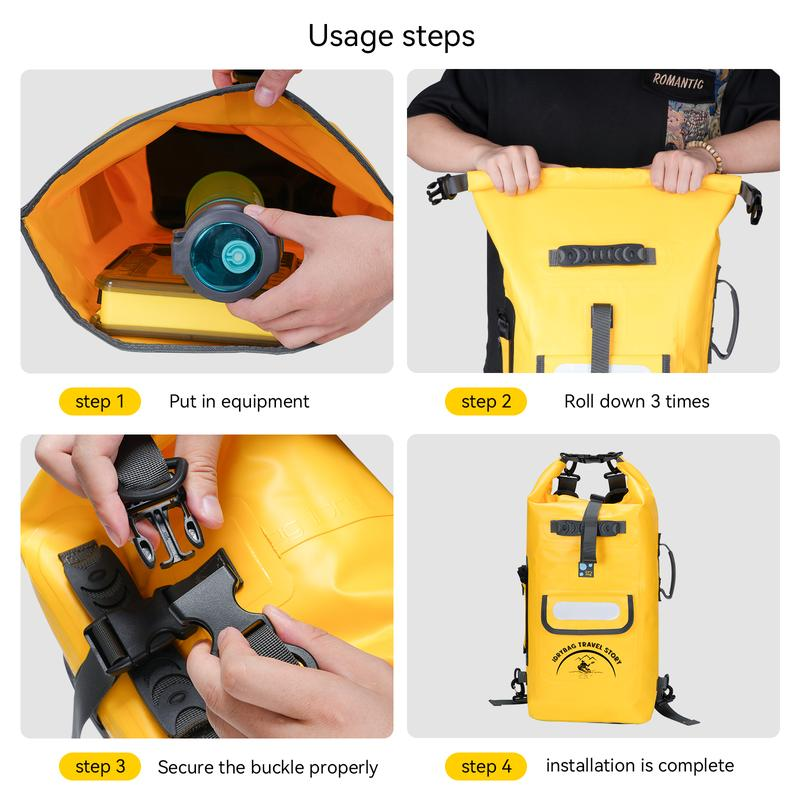 - Easy to Use: Load your gear into the dry backpack. Secure the top with a woven tape and roll it down tightly 3-4 times. Complete the seal by plugging the buckle. Guide the stretched strap over the zipped clip for a more compact fit. The smooth durable surface is easy to clean after each use.