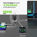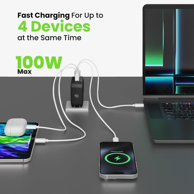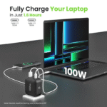 100W Fast Charging in 1.6 Hrs: With a massive 100W output, this charger powers a laptop to 100% in just 1.6 hours! It intelligently distributes power (45W+35W+20W) across 4 ports, charging 3 to 4 devices based on power needs.