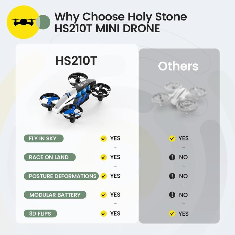- Easy and Fun beginner Drone Toy: One Key Take-off / Land and altitude hold enable this Holy Stone HS210T drone to take off easily and hover at its current height; 3 speed modes from low to high for players with different levels.