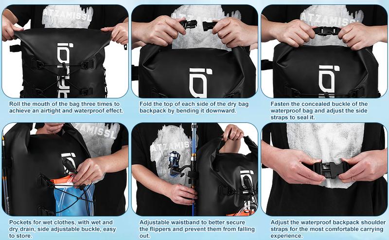 [SEALED WATERPROOF]: Dry bags waterproof with high frequency stitching technology, no pinholes, 100% percent air and water leakage proof. Dust and waterproof rating is IP-68, the waterproof backpack for travel will keep your items dry even if it is completely submerged in water.