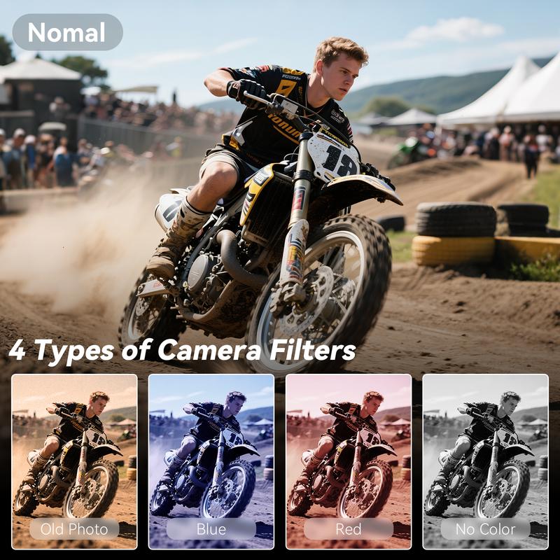 Preview footage in real time on the 1.3-inch color display. Instantly switch between 4 creative filter modes to add style to your videos—perfect for social media sharing.