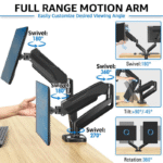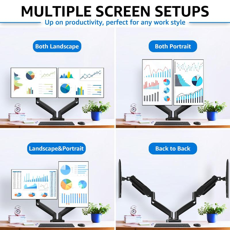 [Full Motion Gas Spring 2 Monitor Mount] full range of motion: free height point with the sturdy pneumatic gas spring, 180°swivel from left to right, +90°/-45°tilt the monitor up and down, 360° rotate horizontal monitors vertically to set up multi combinations for your work style.