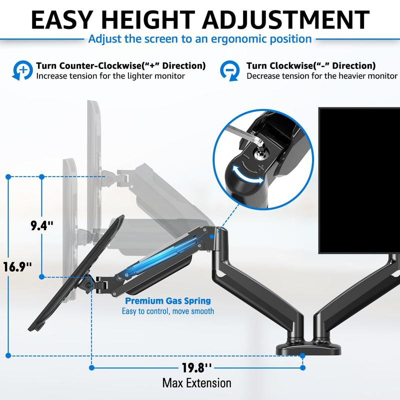 [Improving Posture&Work Efficiency] the dual monitor stand helps to find a healthy working way. Ergonomic design desk mount: smooth height and angle adjustment will make the monitor stay in any place in the air and decrease stress on the neck, shoulder, and back. This monitor mount increases comfort and work focus.