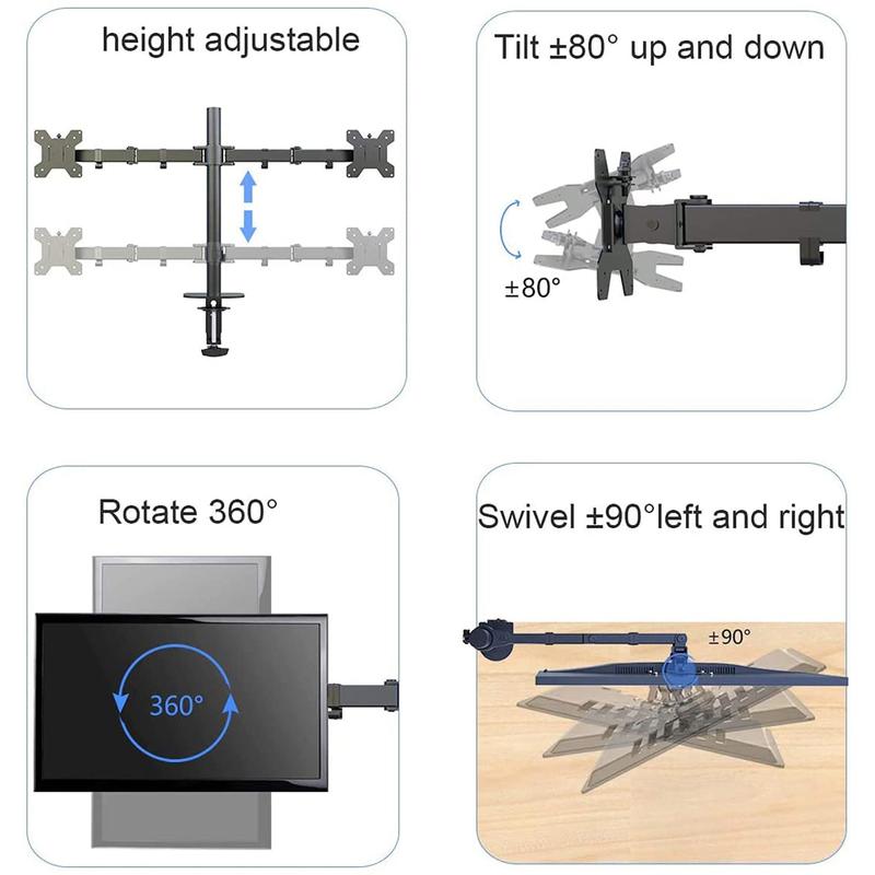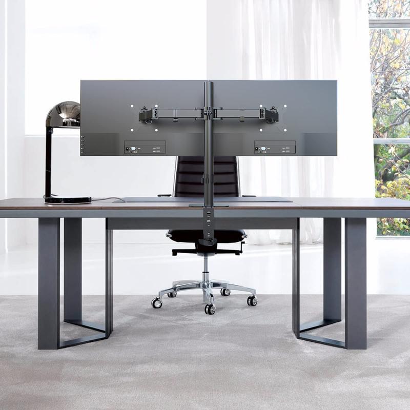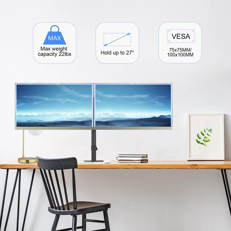 Compatibility – Dual monitor mount ideal for most screens up to 27″ and 22lbs each with 75x75mm or 100x100mm backside mounting holes.