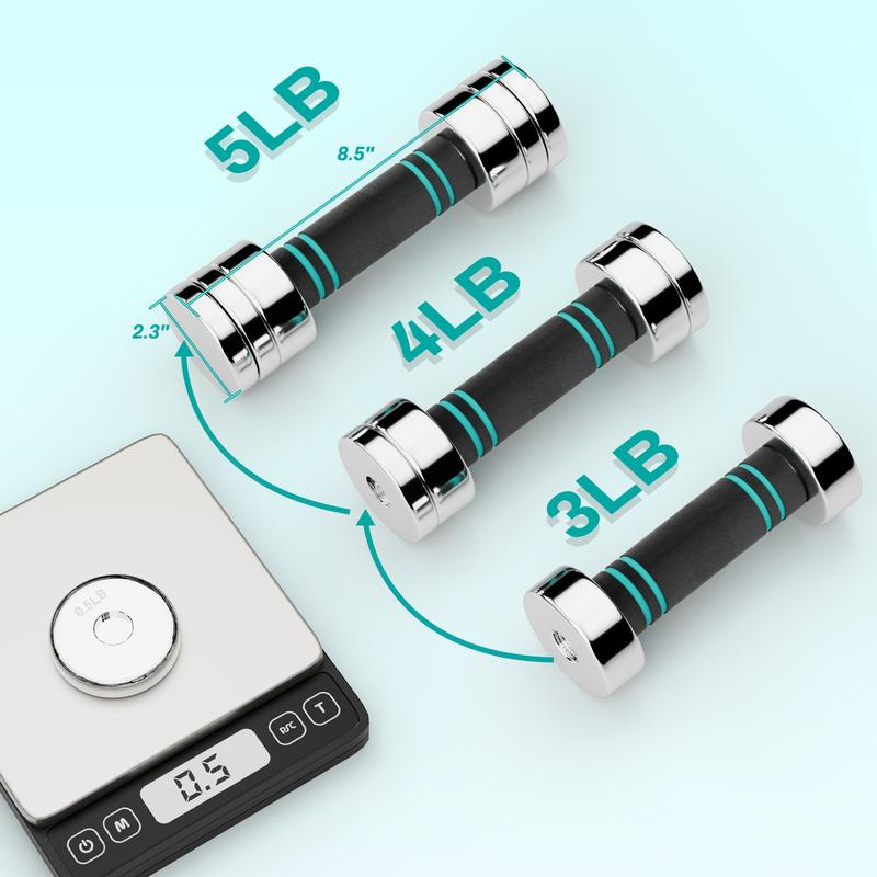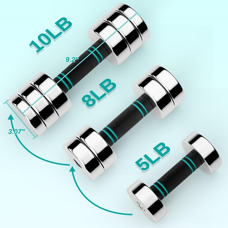 The 5 lb weights steel dumbbells are adjustable weights of 3 lb, 4 lb, 5 lb. The 10 lb weights dumbbells are adjustable weights of 5 lb, 8 lb, 10 lb. The 15 lb dumbbell are adjustable weights of 5 lb, 11.5 lb, 15 lb.This adjustability allows you to customize your workouts and progressively increase weight as you build strength.