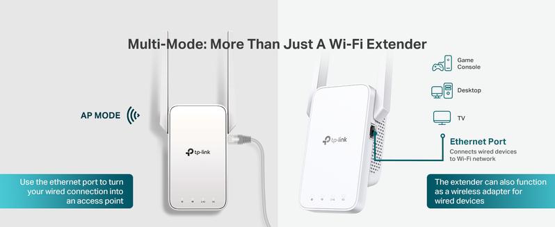- Access Point Mode: The Ethernet port of RE315 can easily turn your wired Internet connection into a wireless access point.It can also function as a wireless adapter to connect wired devices, like Blu-ray player, game console or smart TV