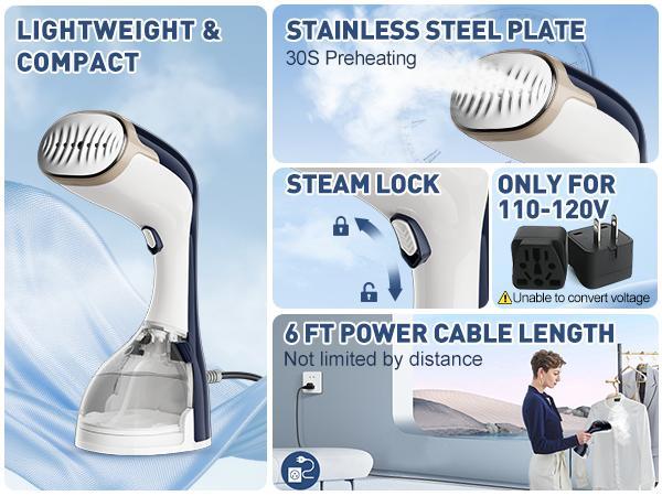 - 【COMPACT & TRAVEL-FRIENDLY】The small and compact travel steamer is portable and easy to store, it can easily fit into any suitcase and carry-on luggage for traveling or business trips. NOTE: Only suitable for the United States, Canada, Japan and other countries and regions with 110-120V voltage. Plugging into a 220V-240V outlet with an adapter or portable converter will cause malfunction
