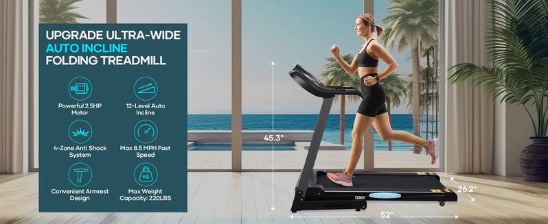 The incline treadmill with an upgrade smooth and strong 2.5HP treadmill motor supports speeds ranging from 0 MPH – 8.5 MPH to help you meet a variety of fitness goals. A soft drop system of treadmill helps you fold and unfold the treadmill deck safely and hands-free.