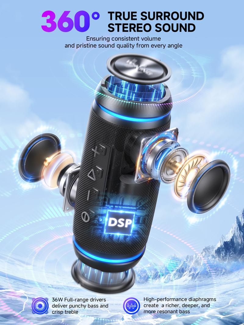 36W Peak 30W RMS Loud Sound – Feel the rhythm anywhere with the bluetooth speaker, delivering deep bass, crisp highs, and distortion-free even at max volume. Thanks to 36W output, the loud speaker product a full bass, giving more depth to music and better overall sound clarity and can provide sound that fills spaces, making it versatile for different environments. The top and bottom diaphragms enhance 30% low frequencies for richer, more immersive sound with a truly impactful bass experience